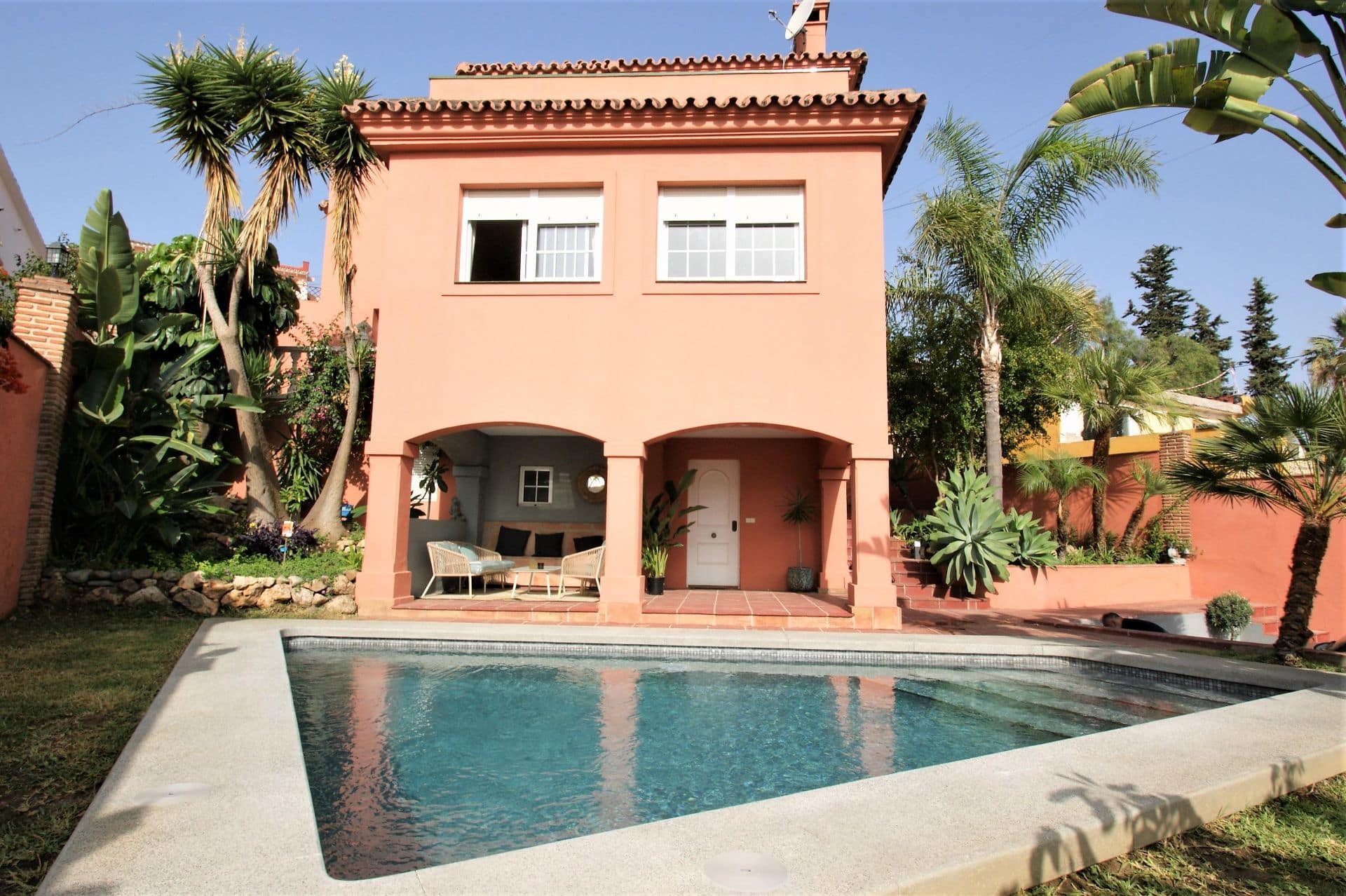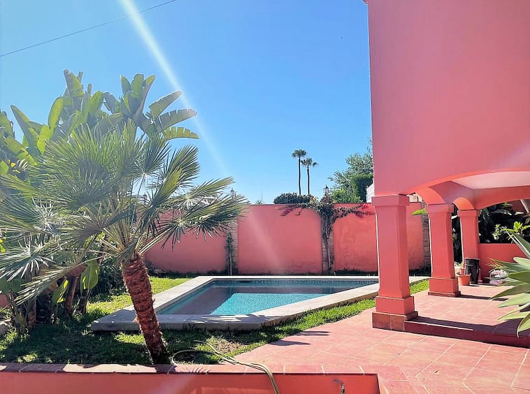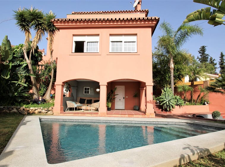 Beautiful villa located in the heart of Nueva Andalucia. Within walking distance to Puerto Banús and shopping areas. The villa consists of 3 bedrooms and two bathrooms + 1 guest toilet. There is an additional bedroom with an independent bathroom on the ground floor, accessible through a separate entrance, which could be used as an office. It features a lovely garden with fruit trees. The living room and kitchen are very spacious, and the bedrooms are also very large. There are terraces off the living room, kitchen, and master bedroom with beautiful views of the mountains and a bit of the sea. There is space to park a car in the indoor garage at the garden entrance. Street parking is also available. The house has a tourist license, generating approximately €50,000 in annual income.