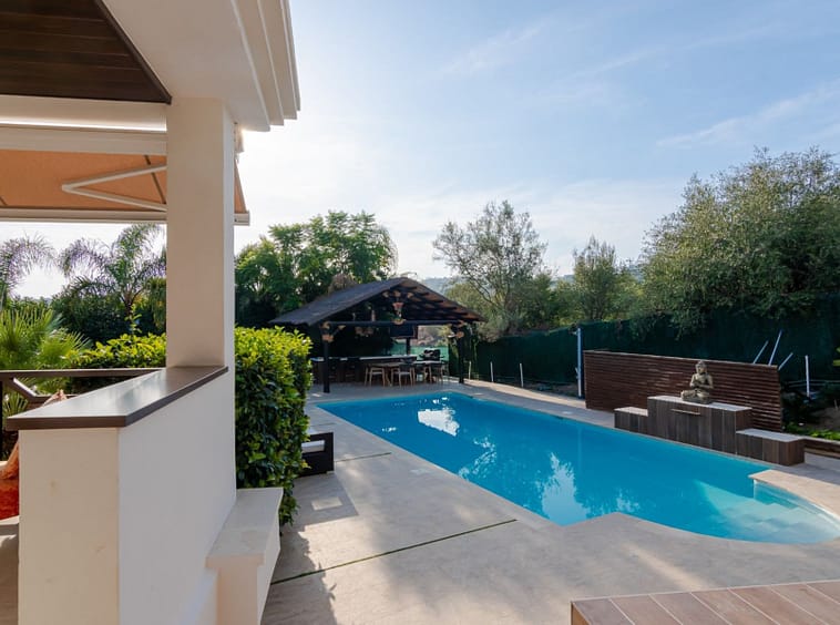 Villa situated in Nueva Andalucia near the golf courses of Nueva Andalucia and La Quinta. The villa is located at the end of a dead end street with a barrier at the beginning for private access. Facing west with views of the surrounding residential area, mountains and countryside, and from where you can see some amazing sunsets. On the entrance level is a living room, dining room, kitchen, guest WC, laundry room and a bedroom suite. The living room, dining area and kitchen all open out to a terrace which leads down to the pool area. Upstairs are three bedroom suites including the master bedroom which has a walk-in dressing room. In the basement there is another bedroom suite plus a small Spa, games room/cinema room, a storage room and a two car garage.